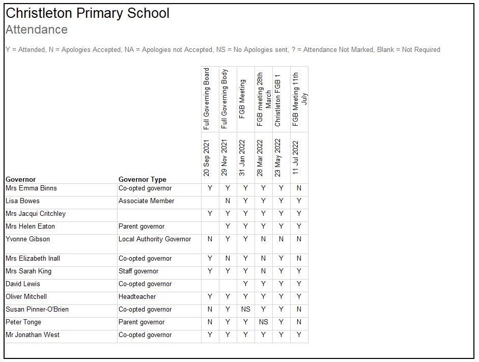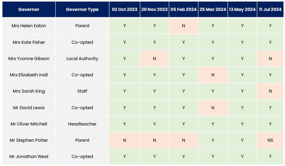 Governor Attendance 2024-2025 2024-25 Governor Impact Assessment 2023-2024 Governor Impact Assessment. 2023-2024 Governor Attendance Governors Allowances Policy September 2024 - September 2025. Instrument of Governance. 2024 2022-2023 Annual Governance Impact Statement 2022-2023 Governor Attendance 2021-2022 Governors Attendance National Governance Association Code of Conduct. Learning and Teaching Terms of Reference. Buildings and Maintenance Terms of Reference. Finance and Staffing Terms of Reference. Disclosure of Conflict or Pecuniary Interest. Qualifications and disqualifications to serve as a school governor. Instrument of Governance. Governing Body Statement of Purpose. 2020-2021 Governor Attendance.